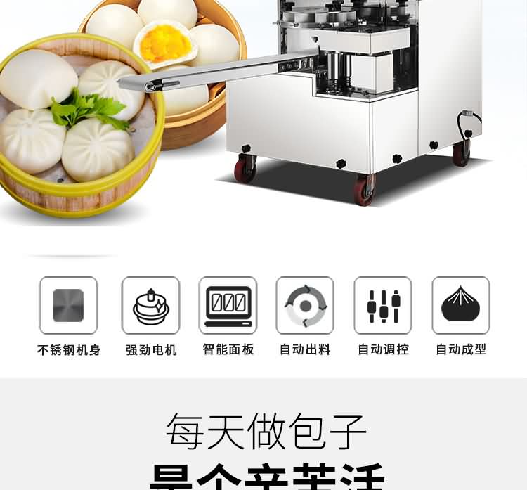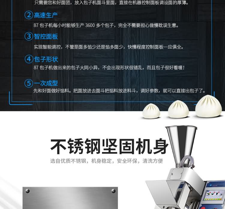 XZ-87型全自動包子機體積小重量輕,不銹鋼的外殼及食品接觸面,外觀精美,花紋更多,設計先進,生產性能穩定精準,結構簡單,操作方便。可生產各種肉包、肉菜包、菜包、小籠包、湯包、水晶包、圓饅頭、奶黃包、豆沙包、叉燒包、南瓜餅等幾十種包餡制品。