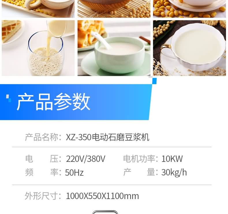 XZ-350電動石磨豆?jié){機,適用于制作豆?jié){;豆?jié){還含有鐵、鈣等礦物質(zhì),尤其是其所含的鈣,雖不及豆腐,但比其他任何乳類都高,非常適合于各種人群,包括老人、成年人和青少年等等。