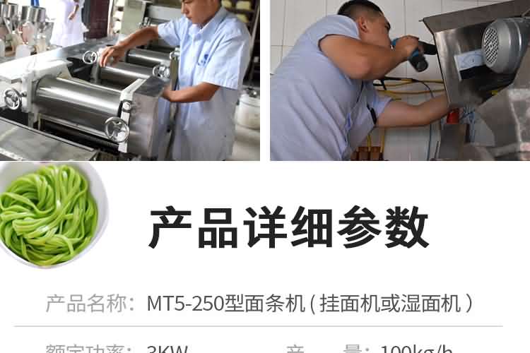 MT5-250面條機 (掛面機或濕面機) | 外形尺寸:2300×600×1400mm 產量:200kg/h 軋輥:98×260mm 功率:3kw 軋輥組數:5組 機重:450kg | 鐵外殼 |