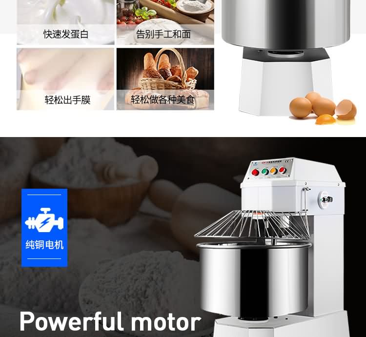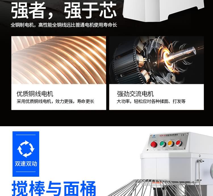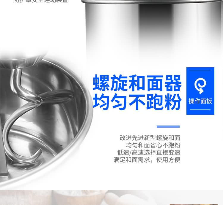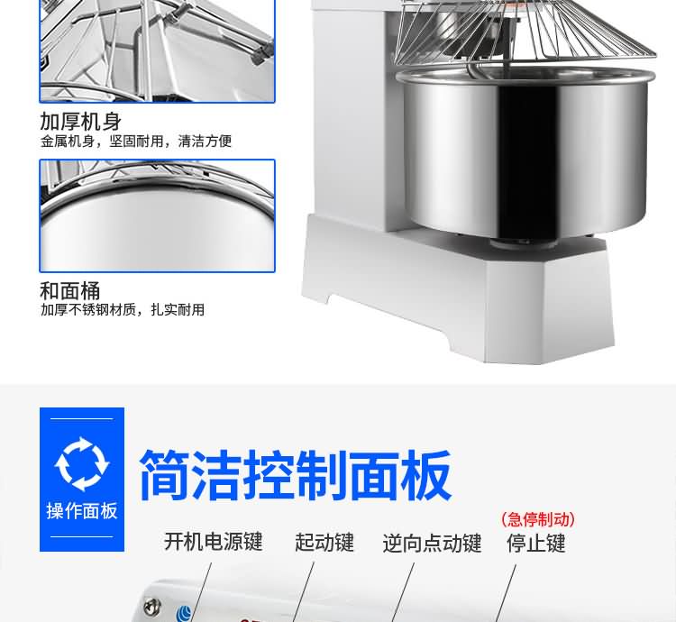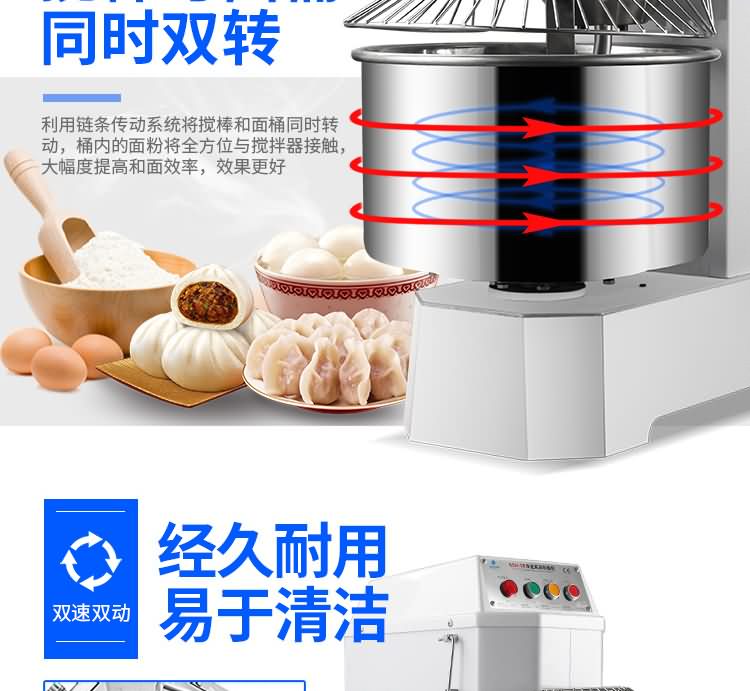 雙速雙動和面機系列,本機適合攪拌各種面包、包子、饅頭、湯圓、披薩餅面團,專業設計避免面團過分升溫并確保面團含氧量。過載、缺相保護裝置,防護罩安全連動裝置。