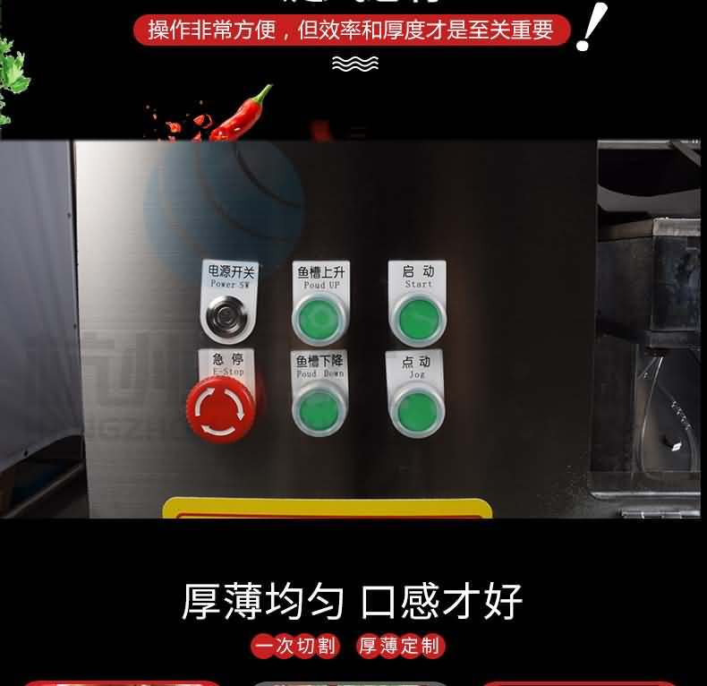 斜度及厚薄默認(rèn)標(biāo)準(zhǔn)為35°、2.5毫米,斜度有(25°、30°、35°、40°、45°)可供選擇定制,厚度可從1.8毫米到10毫米范圍定制,定好規(guī)格不能調(diào)整,不能更換。斜度越小,魚(yú)片越寬。