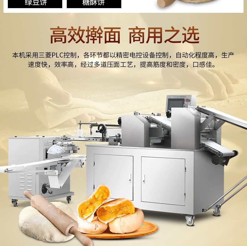 ?生產速度快,效率高,生產流程流暢,各環節都輔以電控設備控制,不會出現堵面,破酥等現象;