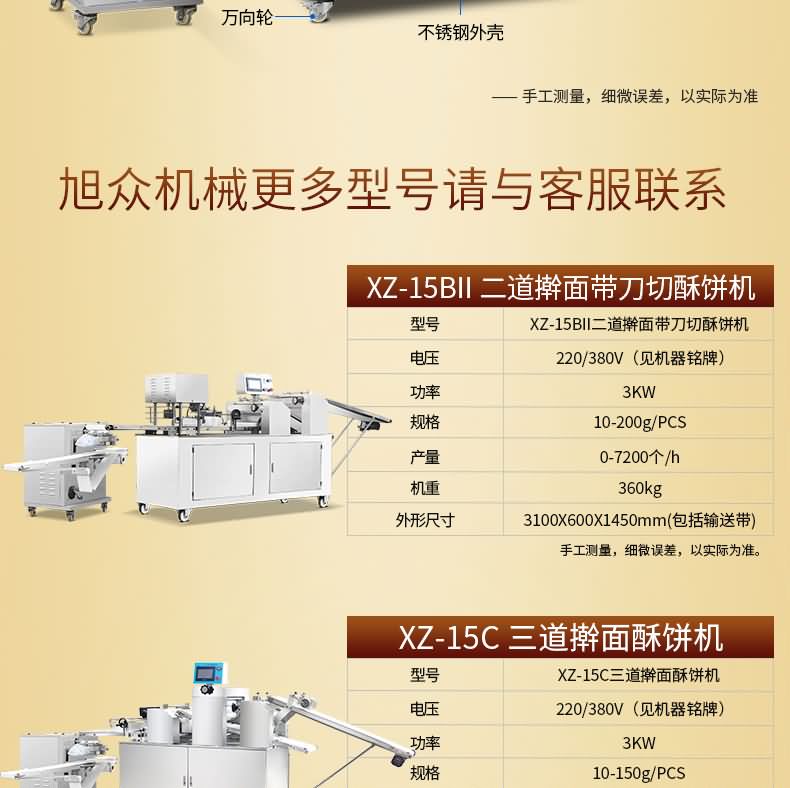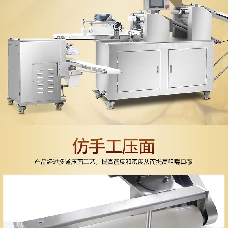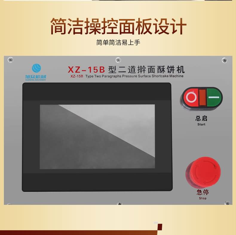 旭眾牌XZ-15B二道搟面酥餅機是我公司仿手工制作面食產品的機型,占地面積小,重量輕,它吸收國內傳統手工制作技術,即運用搟面杖壓面和打擊面團,以保證高面筋性和面帶的密度,并綜合考慮面食的口感而研發。