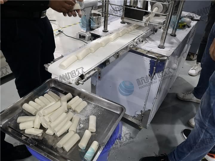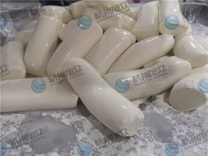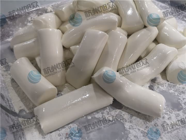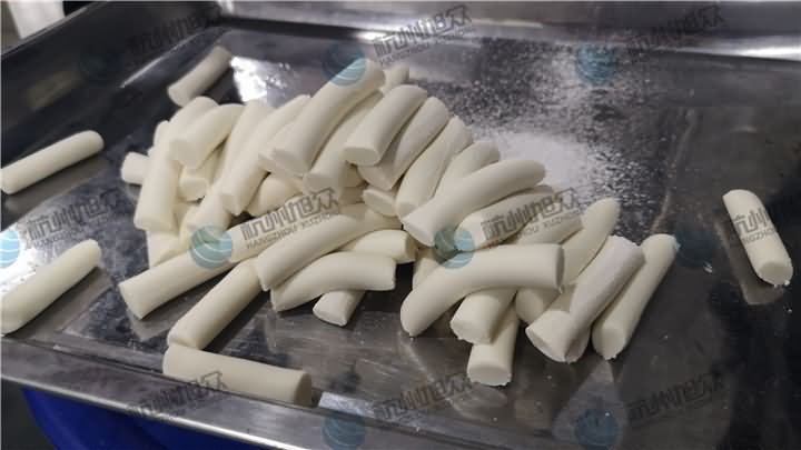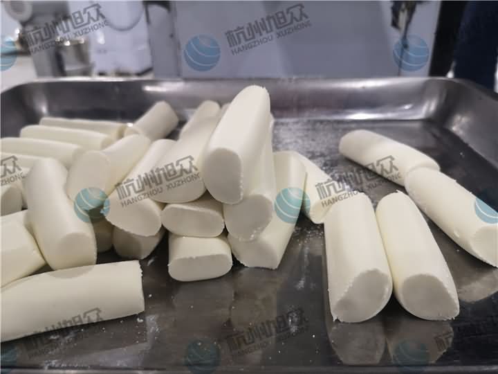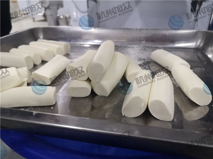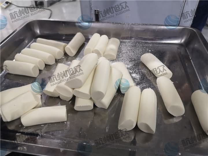 做芋圓啦!不過今天的客戶從山東不遠千里來到杭州旭眾,因為他們自己有在做芋圓,有著自己獨有的芋圓工藝技術,所以前期的工作都是他們的人員加工揉面成團,再通過芋圓機切割成他們想要的規格,由剛開始出兩孔的小芋圓變成單孔的大芋圓,也不知道他們的原料是什么,聞起來有一股奶糖的味道很香,那我們來看看芋圓機做出來的芋圓效果: