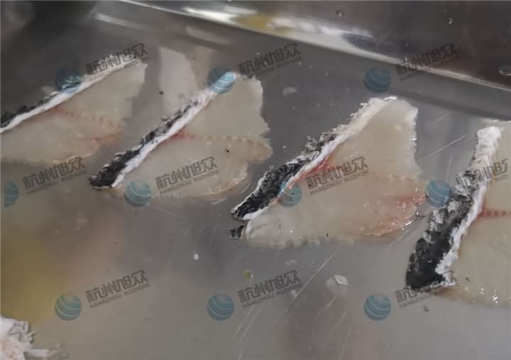 曾有個客戶想要切魚片機,他非得知道用30°2mm規格切魚片的魚片寬度是多少?納尼!!!這個答案我們真的給不了,魚身本來就是長短不一,還得去量它的寬度,量了又如何?其它的又是另一種寬度,當然旭眾機械推崇的是服務至上,為了回答這位客戶的問題,給他安排了2斤的黑魚,魚鱗、內臟、中骨、大骨人工去掉后,再放入XZ-280A全自動切魚片機中切片,切片效果如下圖所示: