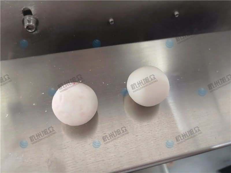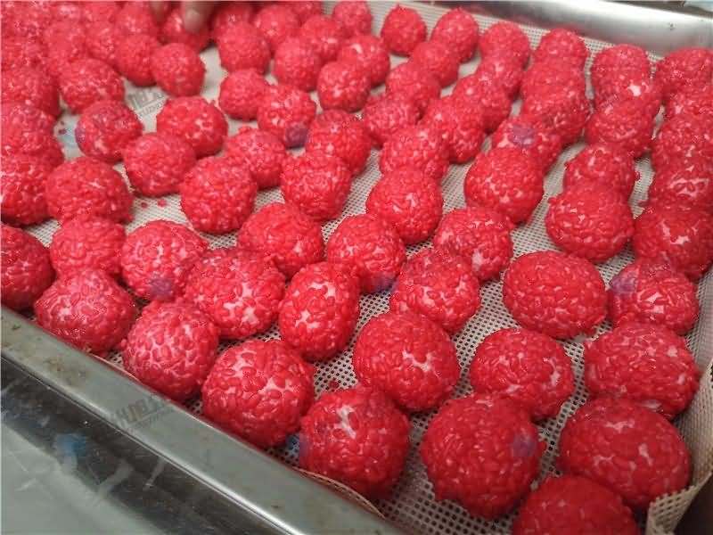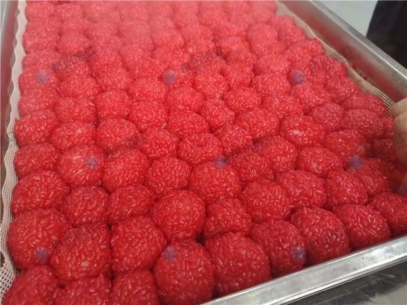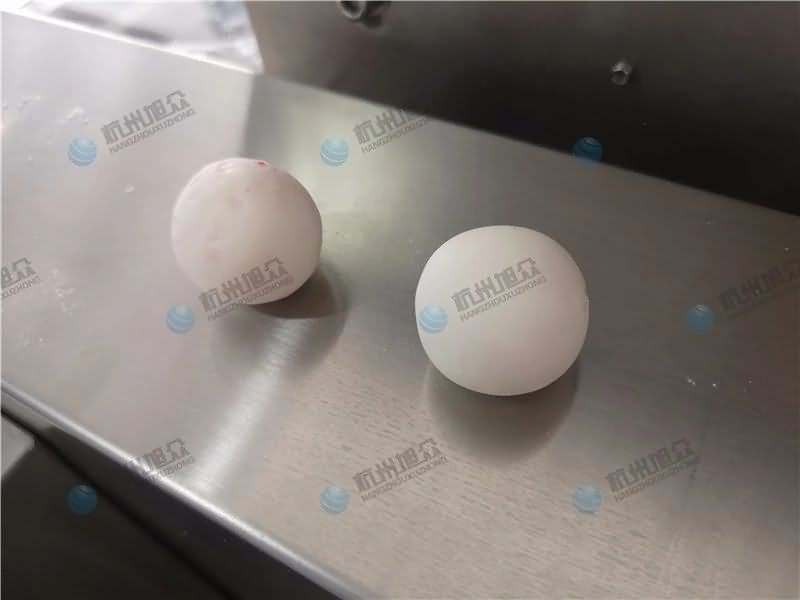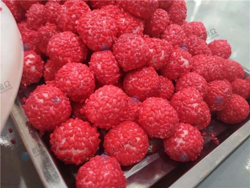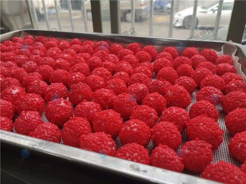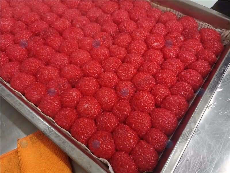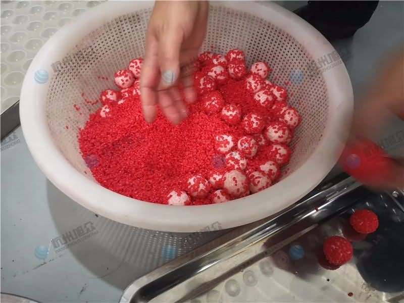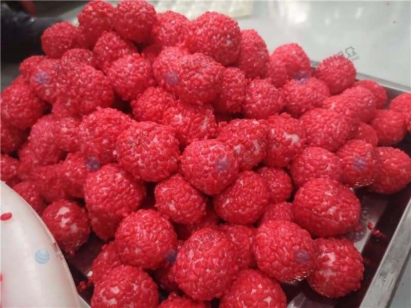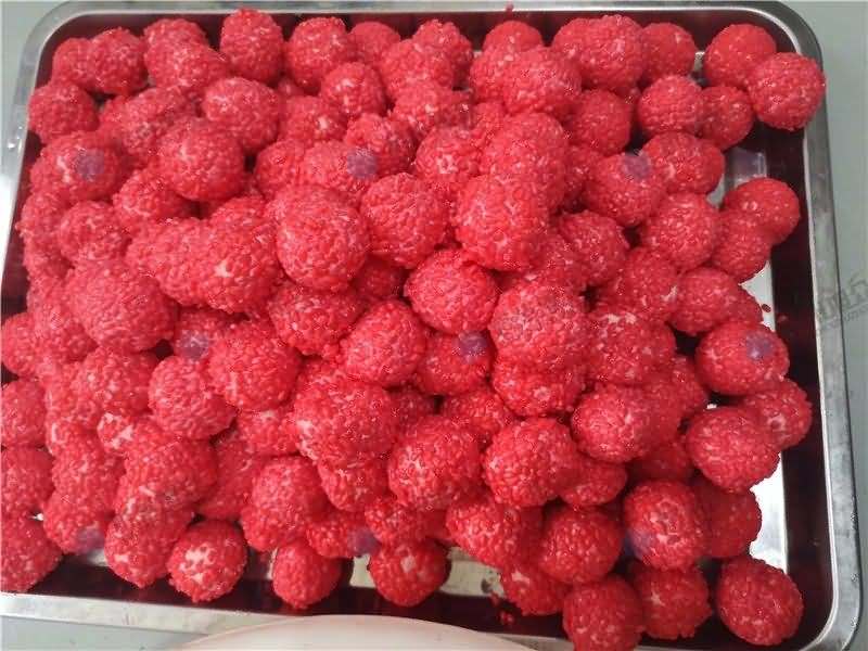 因為餡料、面皮都可是客戶自己準備帶來現(xiàn)場的,所以直奔主題,需要搓圓做成團子形狀,之后再人工裹紅米,因為不帶擺盤的VFD-4000A湯圓機當時沒有樣機,所以安排VFD-4000湯圓機(帶擺盤)做團子。
