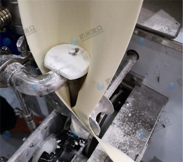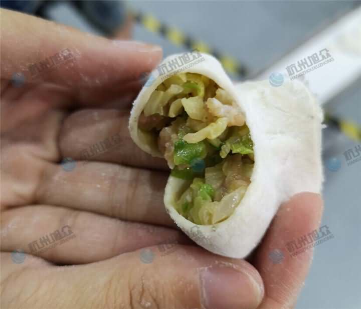 2、將壓好的面皮,鋪在餃子機的輸送架上,再人工將餃子機再次壓成面皮放入對應模具中便可,后續再調整面皮、餡料克重之后,便可自動成型餃子