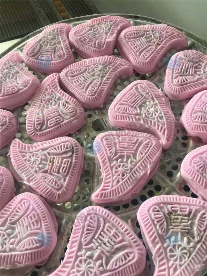 紅桃粿食品廠還在為招不到員工而煩惱嗎?旭眾月餅機流水線輕松解決員工問題,從包餡到印模再到自動擺盤,全自動化生產紅桃粿,有了月餅機流水線紅桃粿的產量也跟上來了,這才是食品廠老板們開廠賺錢的正確操作方式,那么我們先看看月餅機做的紅桃粿: