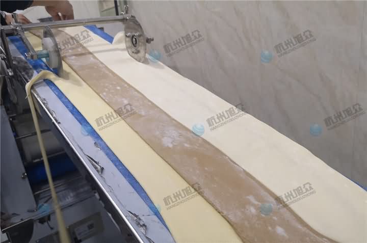 2、面團(tuán)再用壓面機壓成面皮后,按順序擺放好