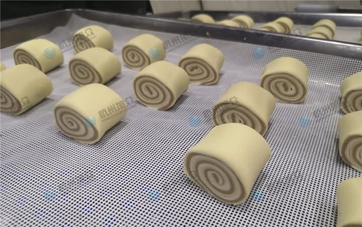 3、將擺放好的面皮放置XZ-290AS卷面式包子機輸送架上,開啟開關(guān),自動整形壓面卷面切割成方饅頭