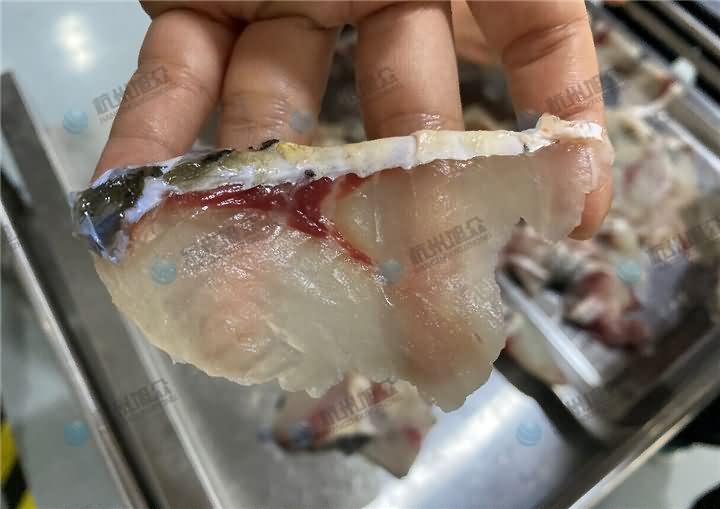 全自動(dòng)切魚片機(jī)現(xiàn)場演示切草魚片,在切草魚片之前要做的工序,先去鱗開肚去內(nèi)臟去魚頭后,再將魚大骨去掉,不去的話刀片容易損壞,所以要將魚大骨剃掉后再用魚片機(jī)30°斜度切成2.3mm魚片: