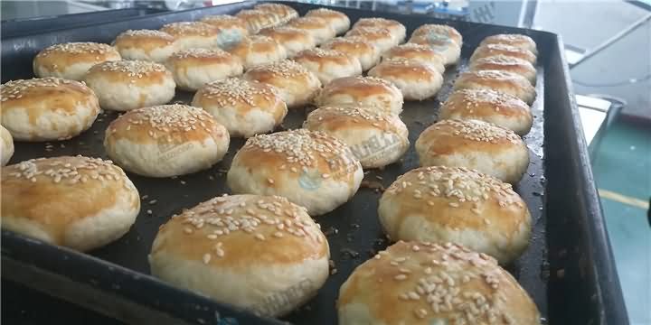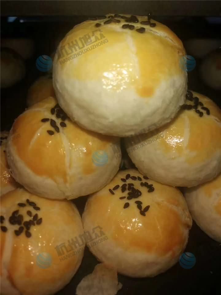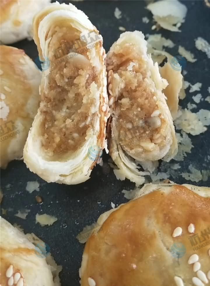 全自動酥餅機自動卷皮包餡成型酥餅,烘烤后的酥餅掰開能看到層層分明的酥脆餅皮,豐富的餡料,酥餅香脆,任誰看了都要忍不住要把它們一個個都吃掉。