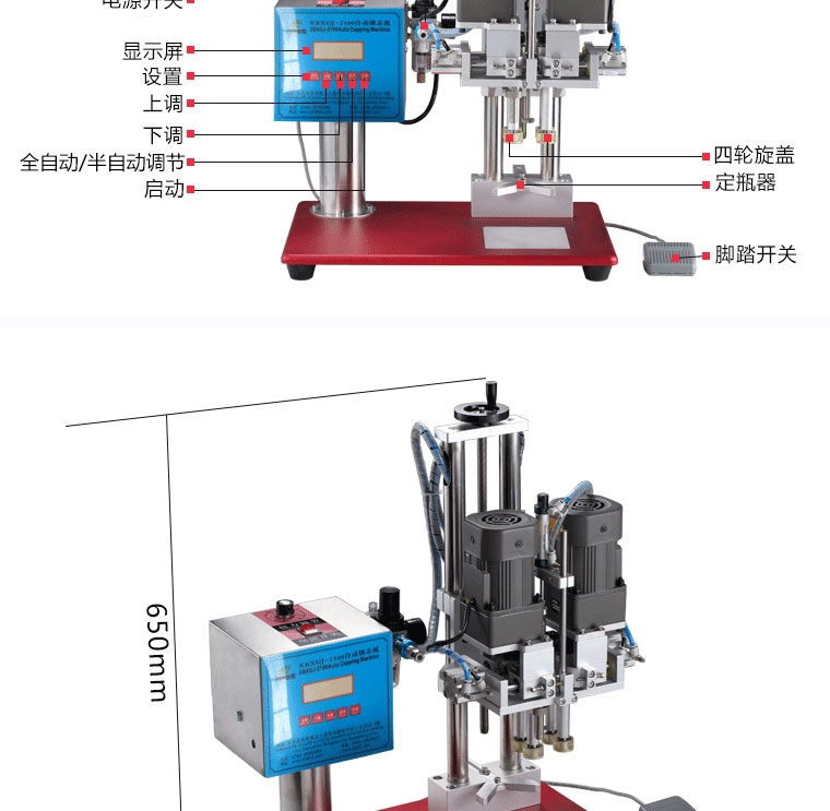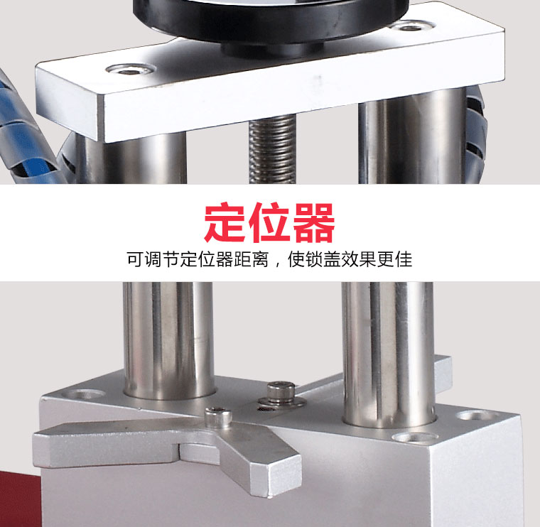 旋蓋機(jī)電氣控制運(yùn)動(dòng),穩(wěn)定性強(qiáng);設(shè)有定位裝置,旋蓋標(biāo)準(zhǔn),操作方便;鎖蓋范圍寬,可鎖不同形狀規(guī)格的瓶蓋;完善了噴頭、泵頭、噴霧泵、手扣式噴槍旋蓋難的問題;鎖蓋轉(zhuǎn)速可調(diào),可根據(jù)不同瓶蓋調(diào)節(jié)松緊度。自動(dòng)鎖蓋機(jī)的的適用用于各種日化、醫(yī)藥、化工行業(yè)的噴頭/泵頭/噴霧泵/手扣式噴槍的瓶蓋鎖蓋機(jī)械。