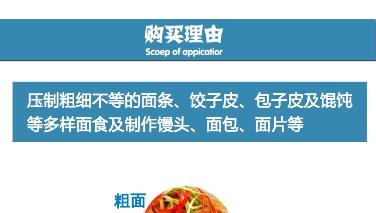 適用于賓館、面包店、糕點廠制作面包、西點、包子,可使反復壓制和面后的面團、面筋,能得到增強。