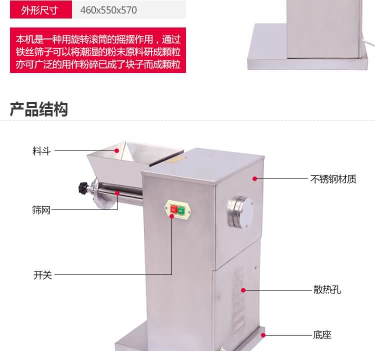 搖擺式顆粒機(jī)可將混合的粉末狀物制成顆粒,也可將塊狀的干料粉碎成所需的顆粒。搖擺式顆粒機(jī)適用于制藥廠、化工廠、食品廠、科研單位、實(shí)驗(yàn)室、醫(yī)院、保健品廠批量生產(chǎn)。搖擺式顆粒機(jī)整機(jī)全部采用優(yōu)質(zhì)不銹鋼制造,符合GMP標(biāo)準(zhǔn)。