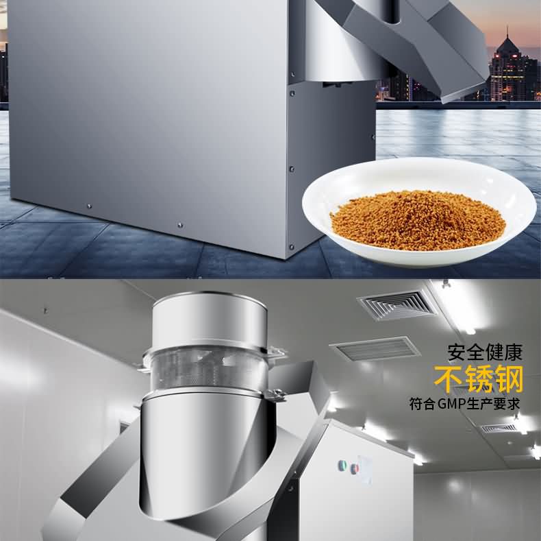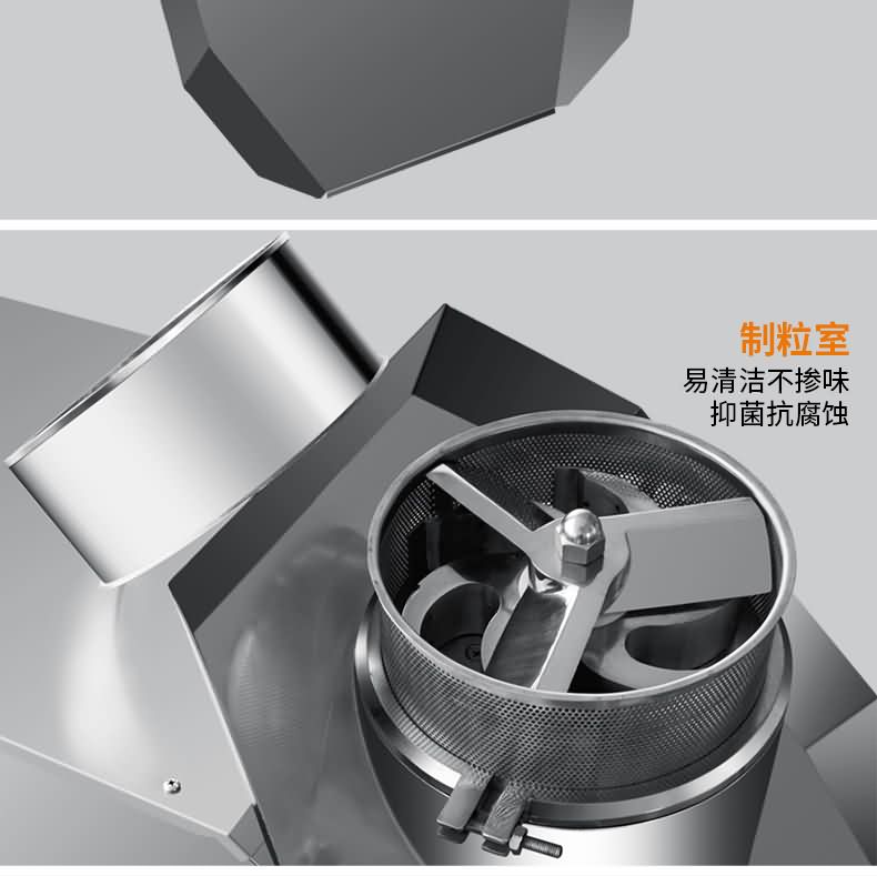 搖擺式顆粒機制得的顆粒一般粒徑分布均勻,有利于濕粒均勻干燥。它的主要特點為旋轉為旋轉滾筒的轉速可以調節,篩網裝卸容易,還可適當調節其松緊。機械傳動系統全部密封在機體內,并附有調節系統,提高了機件的壽命。但由于成粒過程是由滾筒直接壓迫篩網而成粒的,物料對篩網的擠壓力的摩擦力均較大。使用金屬篩網時易產生金屬污染處方,而尼龍篩網由于容易破損需經常更換,在使用時應加以注意。